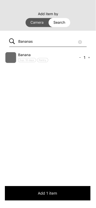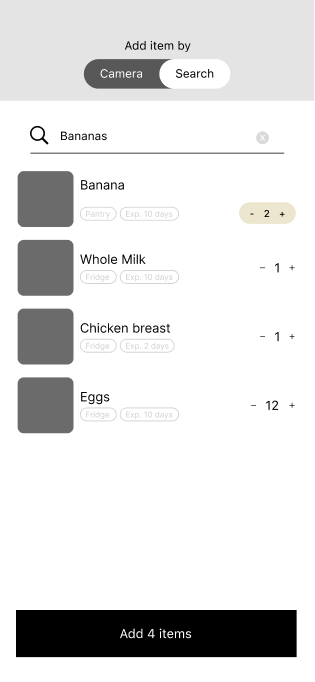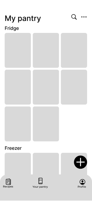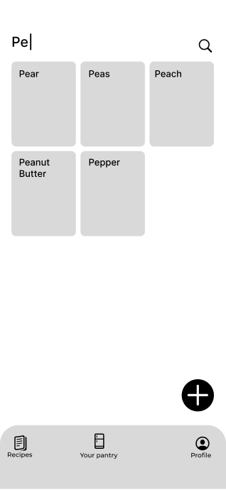Utilizing our design system, we turned our low-fidelity wireframes into hi-fi mockups for three major user flows: Adding an item to your inventory, browsing a recipe using your available items, and viewing more information about an item in your inventory through the item’s details page.