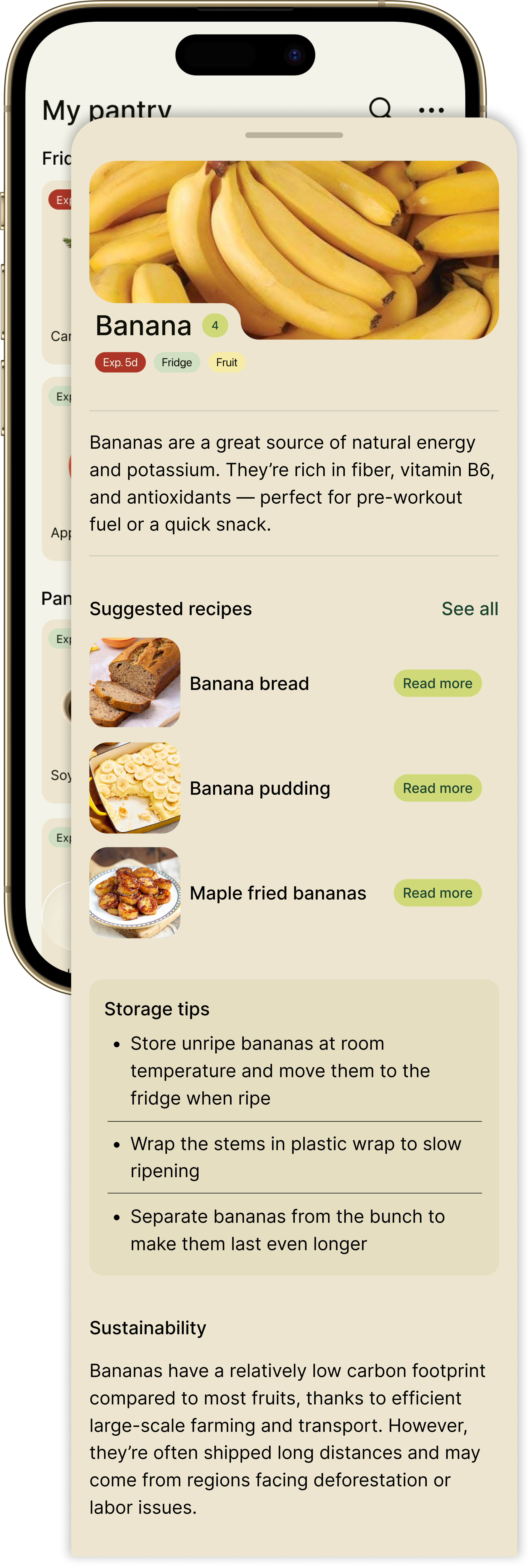 Given more time, we would bring back a revised Insights page that shows users how much they’re saving and how their habits are improving over time. We also plan to explore AI-generated recipes for items that are about to expire, shared household accounts, and smart grocery lists that updateautomatically.