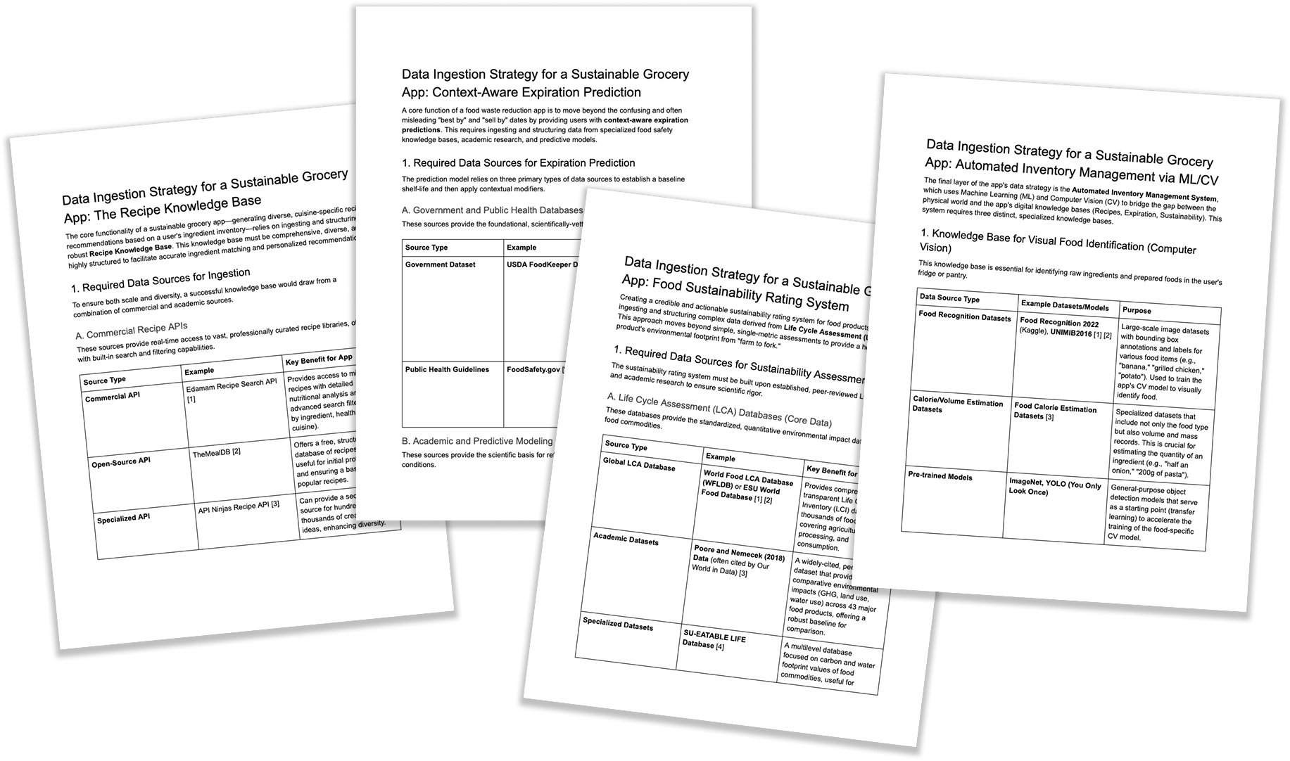 Using this list, we used Manus AI to put together research documents outlining example datasets and models that would create the different layers of our app’s data strategy.